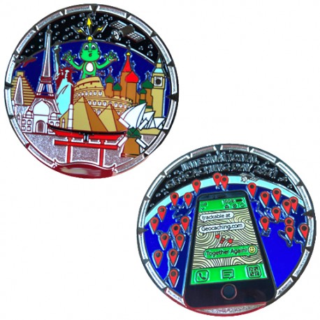 Une face présente la mascotte Signal The Frog admirative, au milieu des monuments les plus célèbres de la planète... comme une invitation au voyage et à la découverte, offerte par le Géocaching.