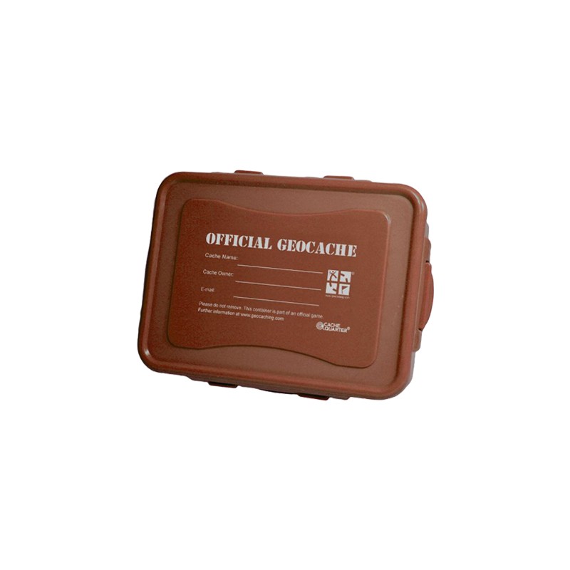 Voilà la "small" idéale ! De couleur bois et facile à cacher, équipée d'un joint silicone et imperméable, préimprimée aux couleurs du Géocaching...
