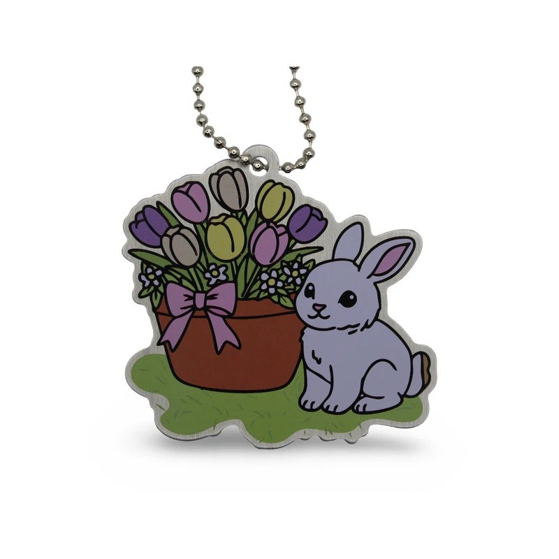 Un très joli Travel Tag printanier : ce lapin tout mignon semblant sortir du pot de tulipes à côté de lui est le traçable parfait pour apporter une touche de gaieté dans les boîtes que vous visiterez.